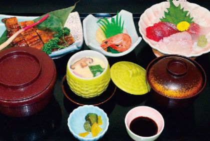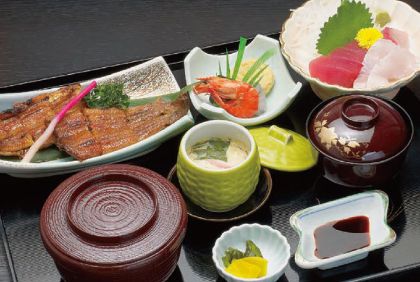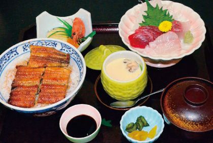 うなぎ長焼(半分)、刺身三色盛、茶碗蒸し、小鉢、ご飯、うな肝吸物、漬物